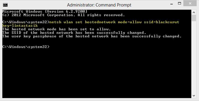 Selanjutnya anda ketikkan netsh wlan set hostednetwork mode=allow ssid=<nama wireless sharing> key=<password / security>. ssid ini akan tampil ketika anda melakukan scaning jaringan wireless di perangkat lain, dan key untuk security-nya, disesuaikan dengan kebutuhan anda.